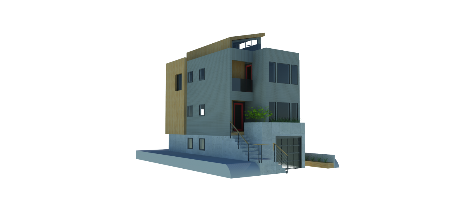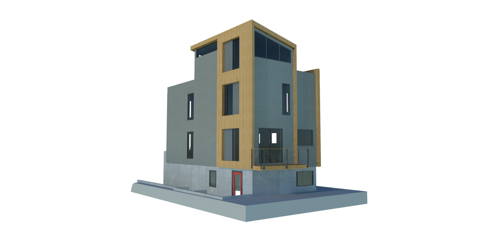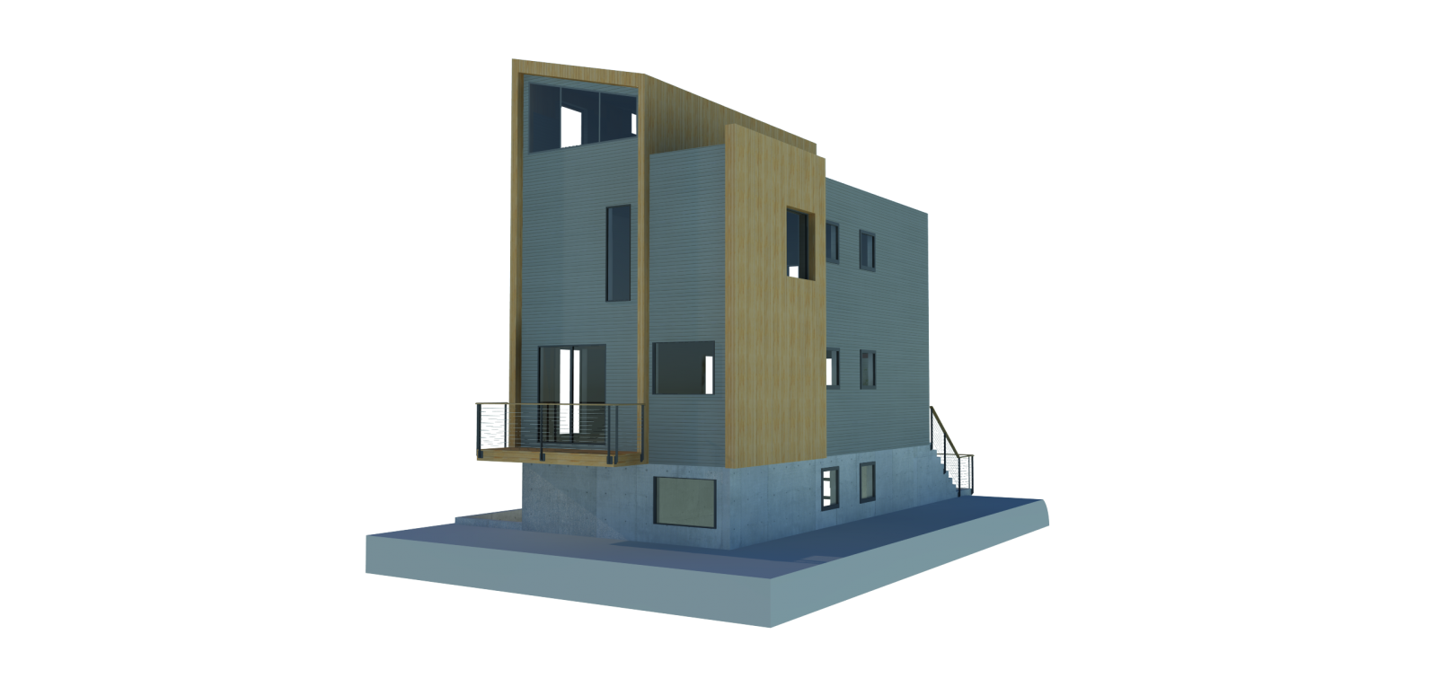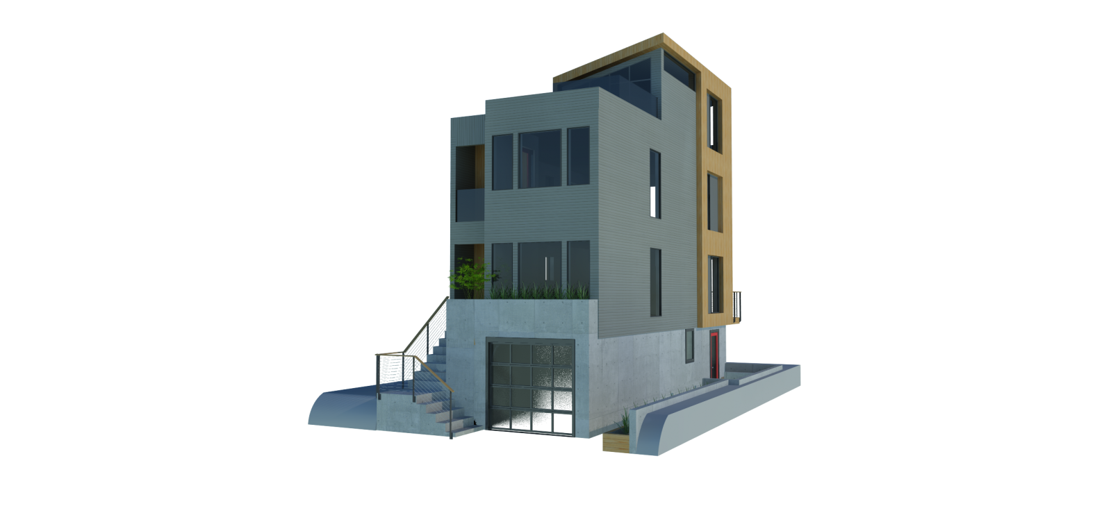 Seeking to make the most of an already dense, R1-zoned lot in Portland’s inner East Side, this project endeavors to bring an elegance often lacking in new development on narrow lots. With a footprint of only 640 SF, the structure provides an impressive amount of amenities, from a rent-able “flex-space” suitable for live-work or short term AirBnB income to a small utility space for storing everything from a smart-car to kayaks – an amenity increasingly lacking in urban development. The heart of the dwelling is a 2BR, 2BA unit (excluding the bonus flex space with full bathroom) featuring an open plan living level with an entertainer’s kitchen and a third floor family room. Rounding out the ensemble is a rooftop sky-deck with full height windows and operable glass openings with generous views of downtown, from the site’s elevated location. Glass railings and private balconies from the master bedroom and a back deck provide access to outdoor space in the heart of the city.