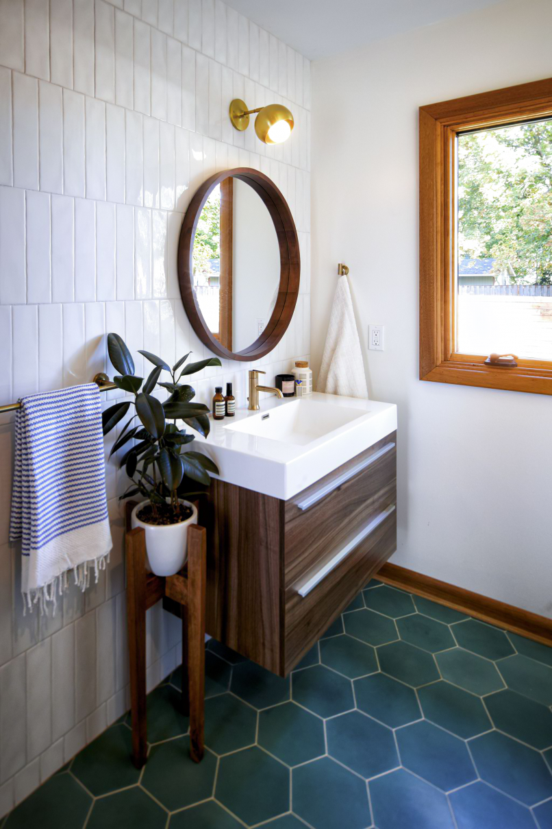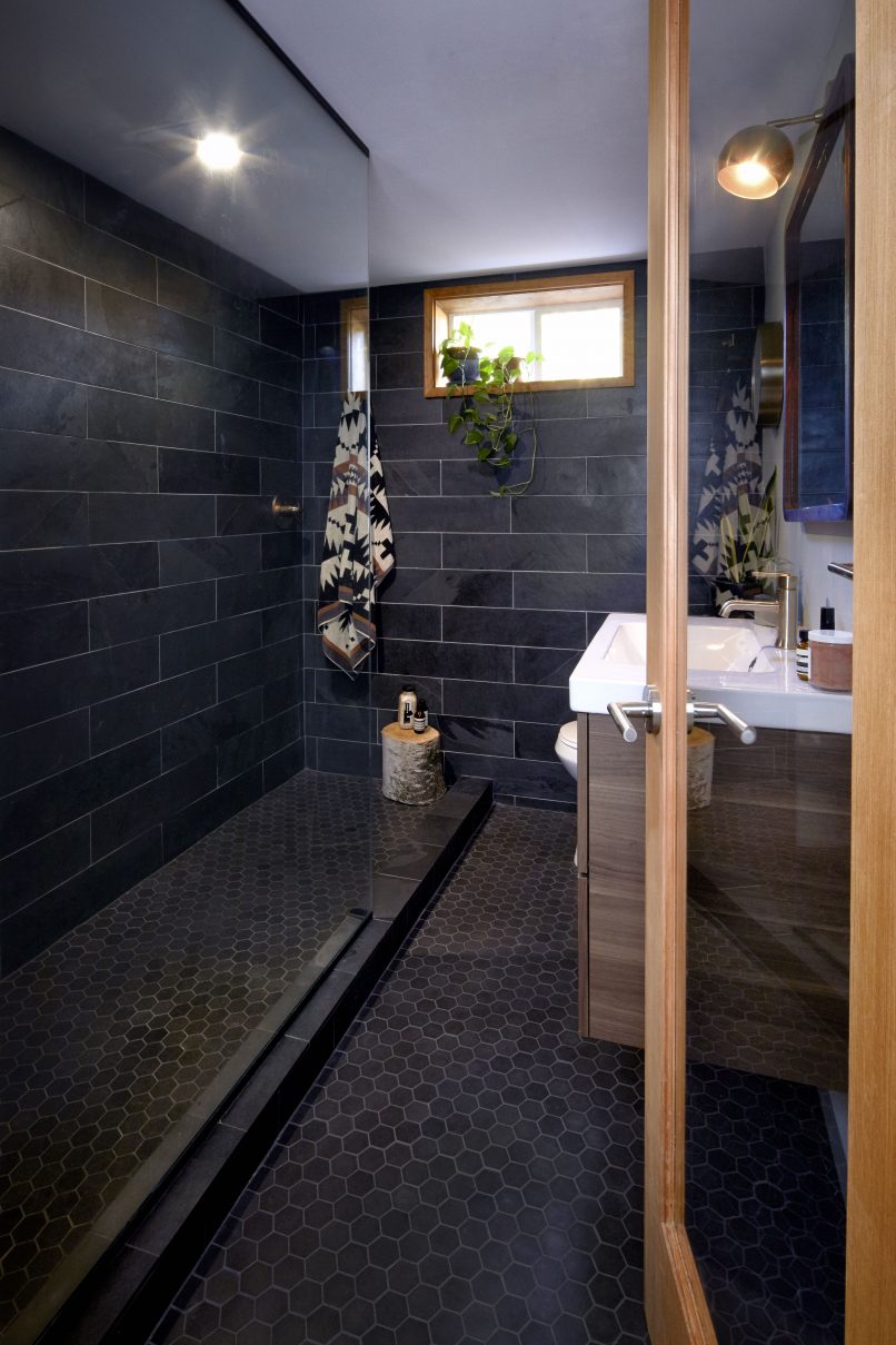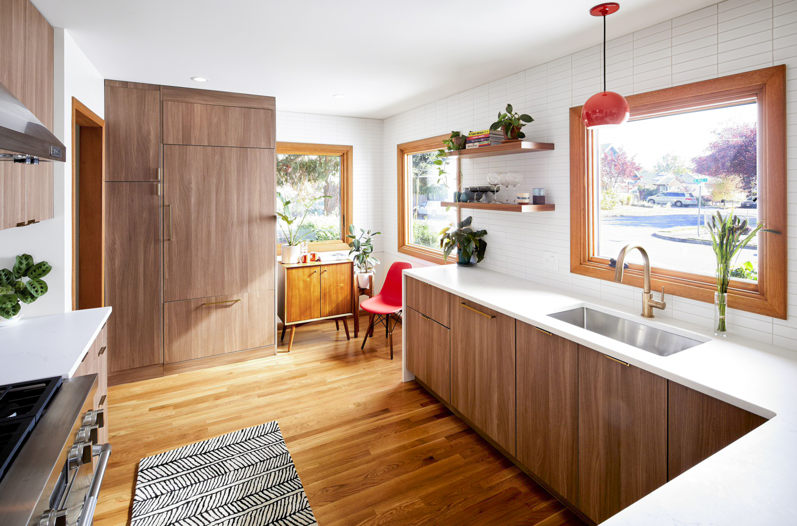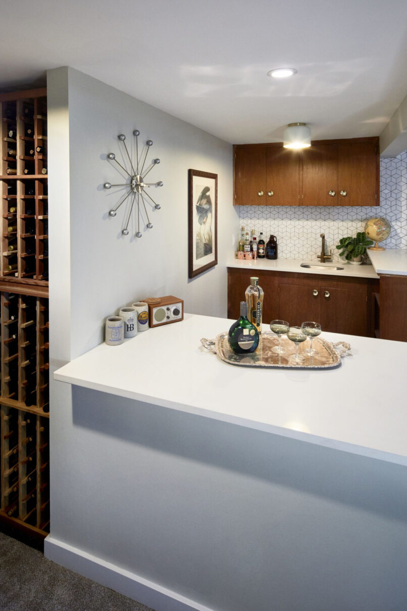 When the client purchased this home from the nearby church as a gut-to-the-studs investment project, they fell in love with it in spite of themselves and made it their primary residence with the dream of the midcentury marvel it could be. Fast forward 1 year later, THESIS Studio helped them spearhead a comprehensive remodel, including a fully finished 1300 SF basement level with surprising amounts of natural light, and a moody, masculine lower level bathroom and sauna. Upstairs, every surface was touched, resulting in an open-concept floorpan uniting the kitchen, dining and living, for a spacious and light-filled interior with a warm palette of mixed wood species and midcentury inspired finishes and furnishings. Whimsical and bold tile selections are interspersed through the project, along with luxe and custom details such as radiant floors, panel-faced appliances, waterfall quartz countertops and large original wood-burning fireplaces and mahogany casework on both levels.