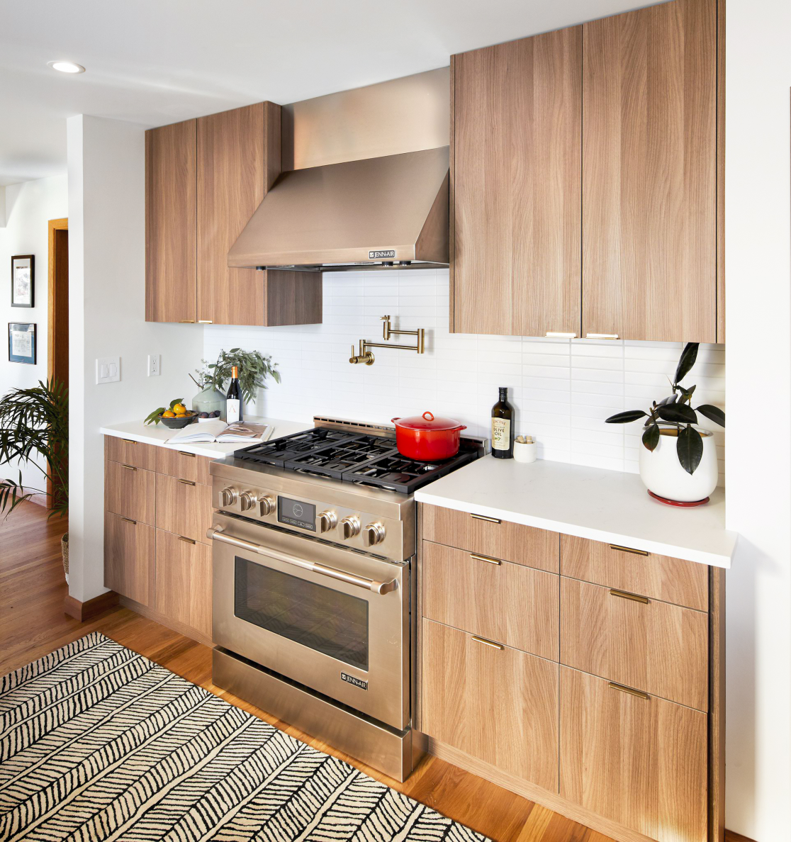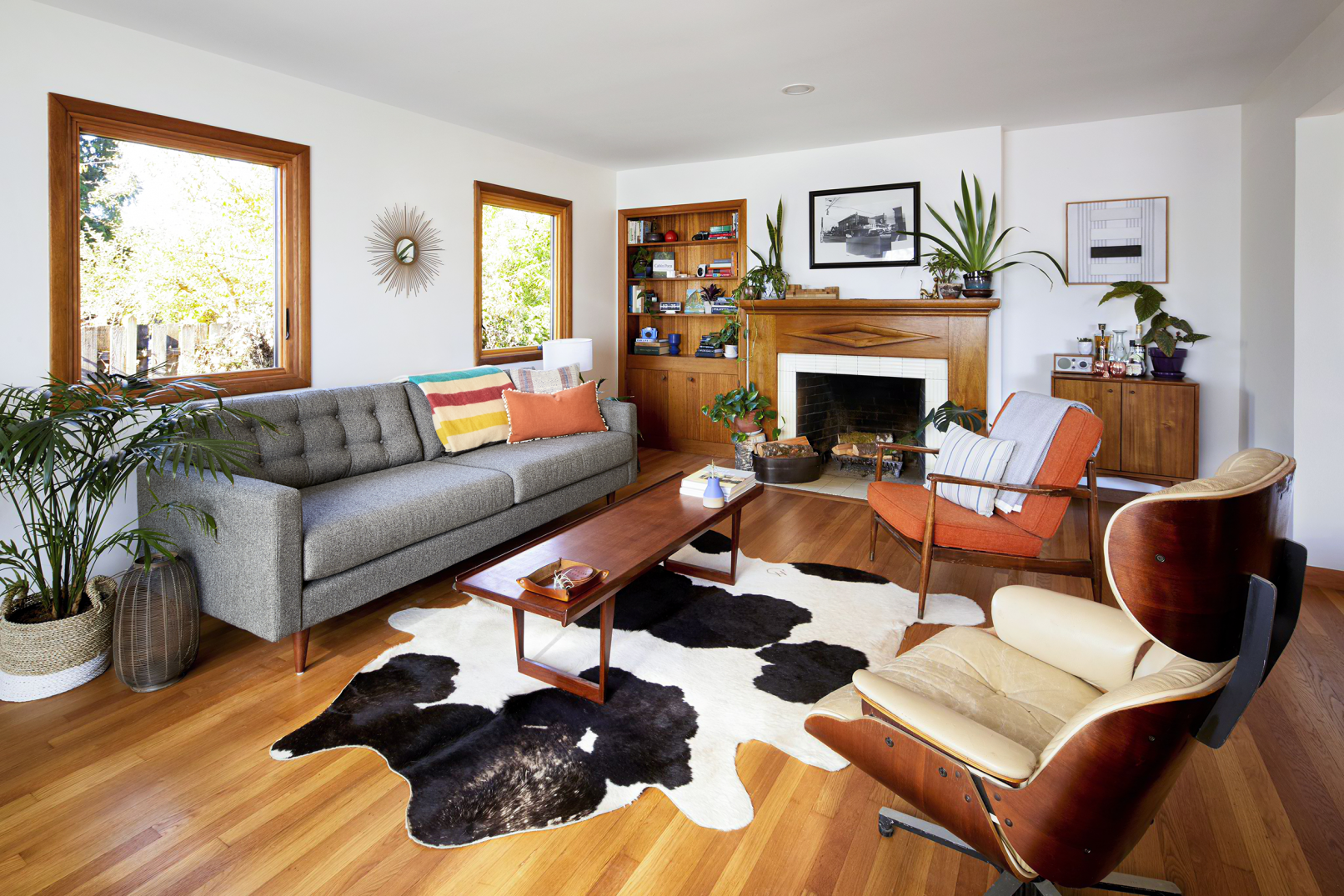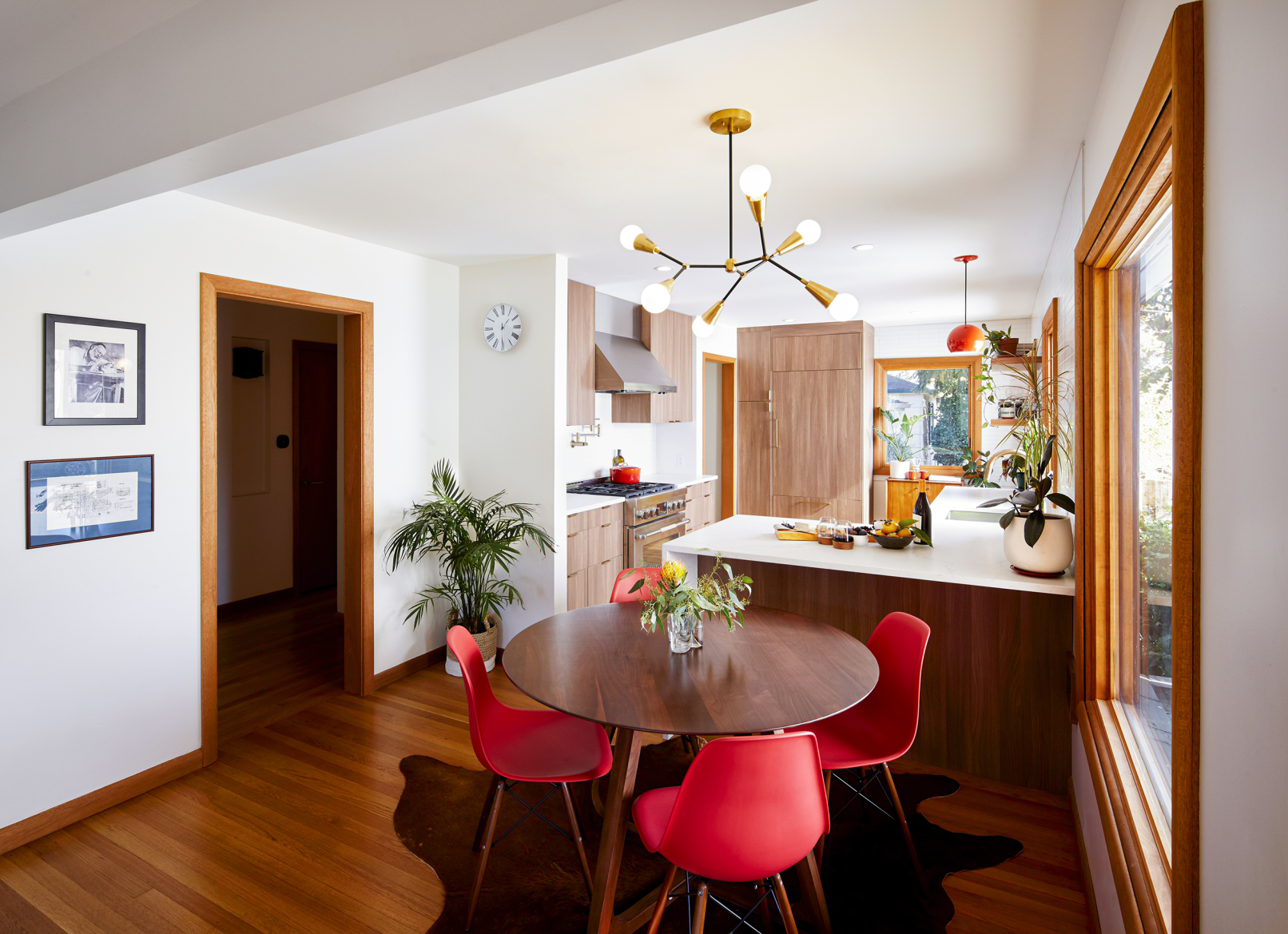 When the client purchased this home from the nearby church as a gut-to-the-studs investment project, they fell in love with it in spite of themselves and made it their primary residence with the dream of the midcentury marvel it could be. Fast forward 1 year later, THESIS Studio helped them spearhead a comprehensive remodel, including a fully finished 1300 SF basement level with surprising amounts of natural light, and a moody, masculine lower level bathroom and sauna. Upstairs, every surface was touched, resulting in an open-concept floorpan uniting the kitchen, dining and living, for a spacious and light-filled interior with a warm palette of mixed wood species and midcentury inspired finishes and furnishings. Whimsical and bold tile selections are interspersed through the project, along with luxe and custom details such as radiant floors, panel-faced appliances, waterfall quartz countertops and large original wood-burning fireplaces and mahogany casework on both levels.