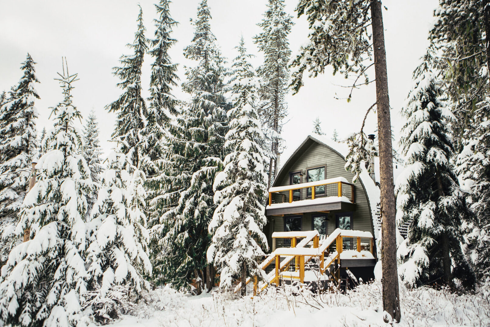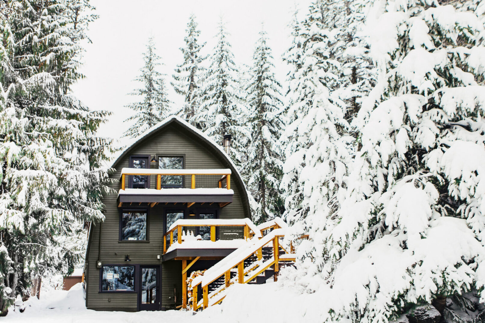 Situated prominently in an idyllic, ski-in setting in Government Camp, this historic arched cabin had faced decades of neglect and disrepair when THESIS and North Swell Design Build were called in by its new owners. Never lacking for occupants, the cabin had been home to a rotating cast of alpine enthusiasts, but the toll on the house was severe. THESIS put in place a comprehensive plan to refresh the structure inside and out, and further protect it against the harsh winter elements. By removing a central stair, the dwelling was rendered into two parts, a lower “efficiency unit” and a 3 bedroom, 2-story upper unit. North Swell Design Build, the sister construction company of THESIS quickly came in to implement the plan. The exterior was overhauled top to bottom, and rickety dry-rotted DIY balconies and stairs were ripped off in favor of structurally sound decks and stairs with resilient bamboo composite finish decking, designed to handle the harsh freeze-thaw cycle of the area. Disintegrating T111 siding was removed throughout and replaced with a fiber-cement lap rain screen on the two gable ends of the house. Inside, new finishes throughout and the cosmetic renovation of 3 bathrooms and 2 kitchens completed the transformation, rendering the interior in moody, natural materials and woodsy vernacular. THESIS helped spec a full suite of interior furnishings centering on vintage finds and eclectic homages to the cabin retreats that live in all our collective memories.