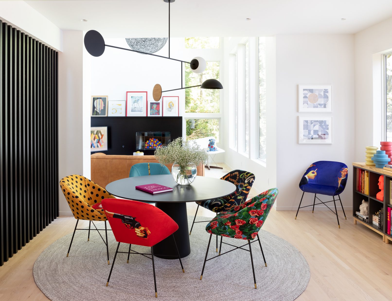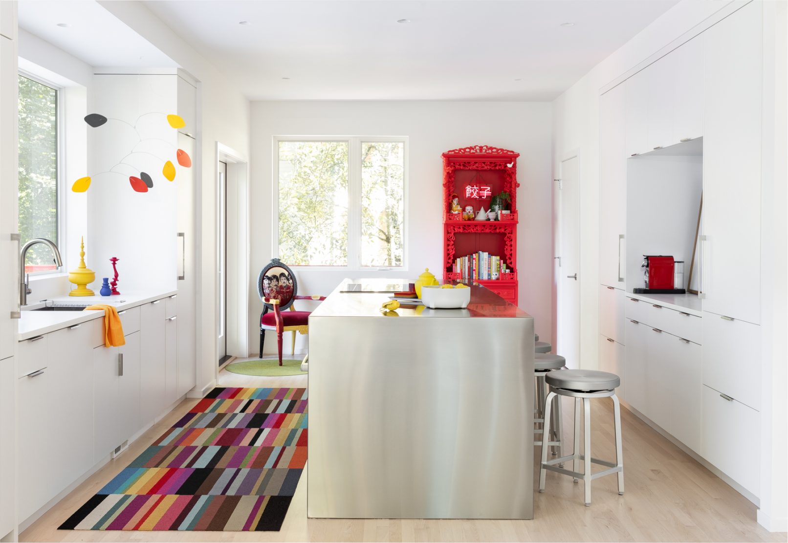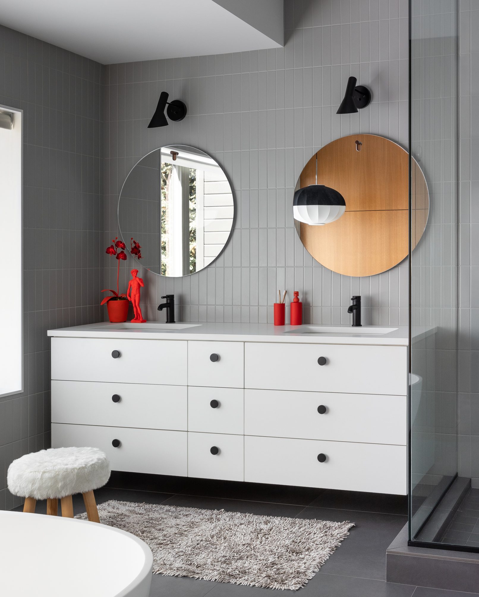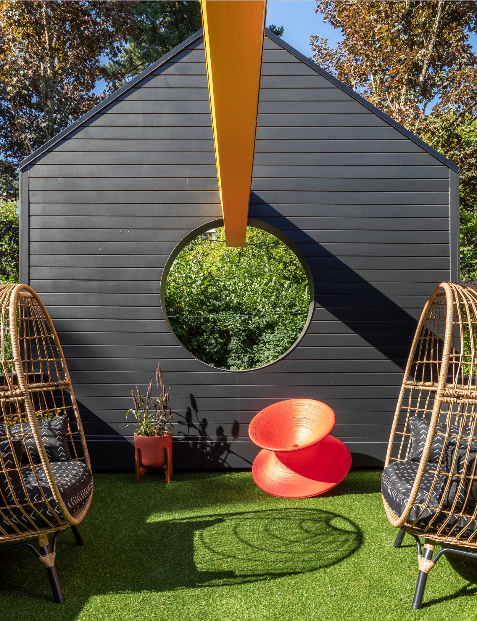 What began as a stereotypical early 90’s home, complete with angled soffits, pink sinks, glass block windows, and carpeted bathrooms, is now a unique modern abode sitting alongside a wooded hill in the SW Portland neighborhood of Healy Heights. The final design was a collaborative process between the THESIS design team, Hammer & Hand Construction, and the passionate and creative homeowners, both of whom are graphic artists. The owner’s design brief involved a restrained overall palette for the interior, creating a bright and airy “vessel” for their art, which is bold, punchy, and ever-changing. On the exterior, a moody black body color for the home is set off by powder-coated metalwork in primary colors – a striking visual surprise in the backdrop of the forest setting. A singular statement on the exterior comes in the form of a punched circular opening in a gabled parapet that highlights a roof deck inspired by the client’s favorite movie – Tim Burton’s Beetlejuice. The result is a home that is as much art as it is architecture, and is a deeply personal expression of the clients own unique aesthetic. Photos by Haris Kenjar Photography