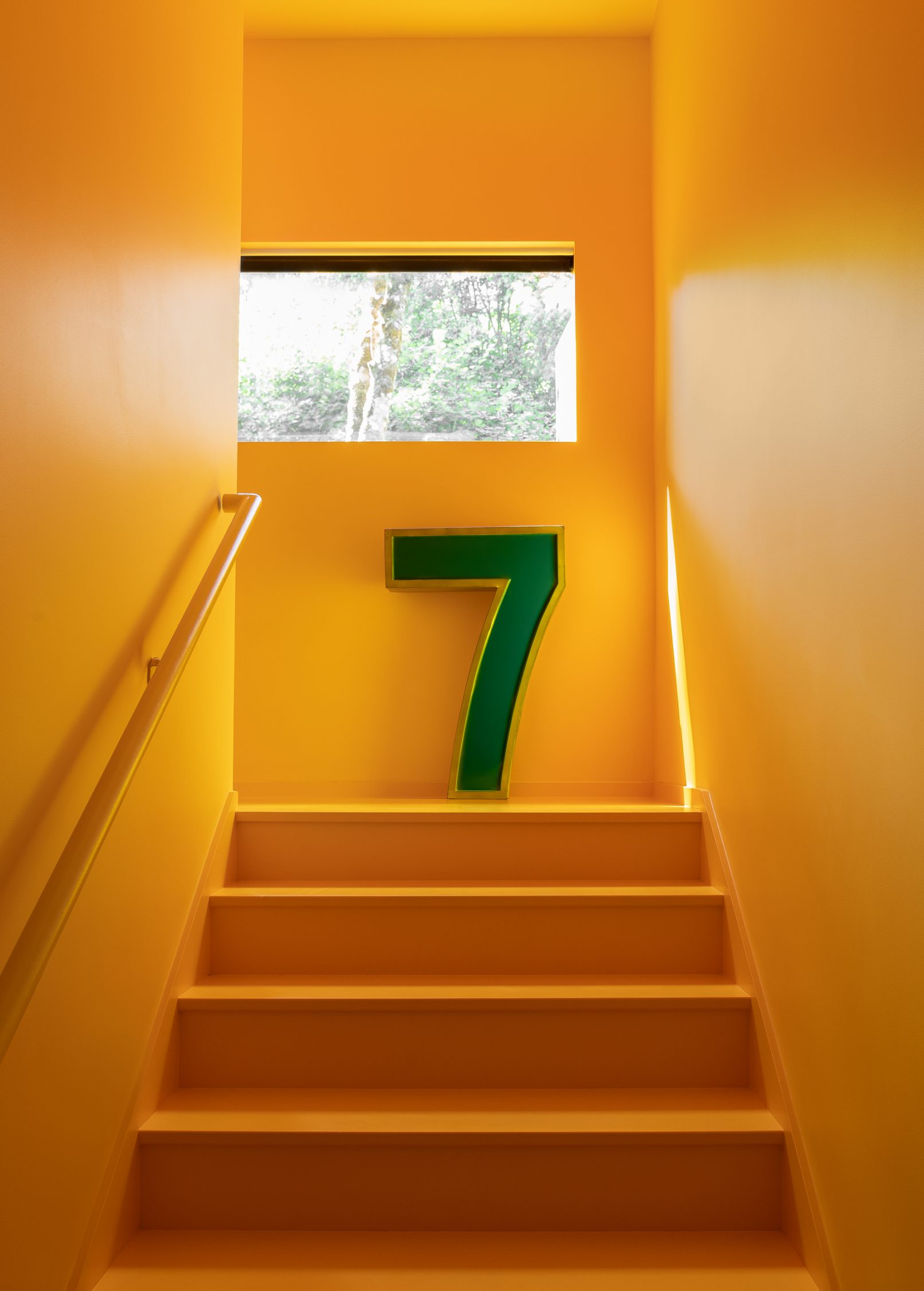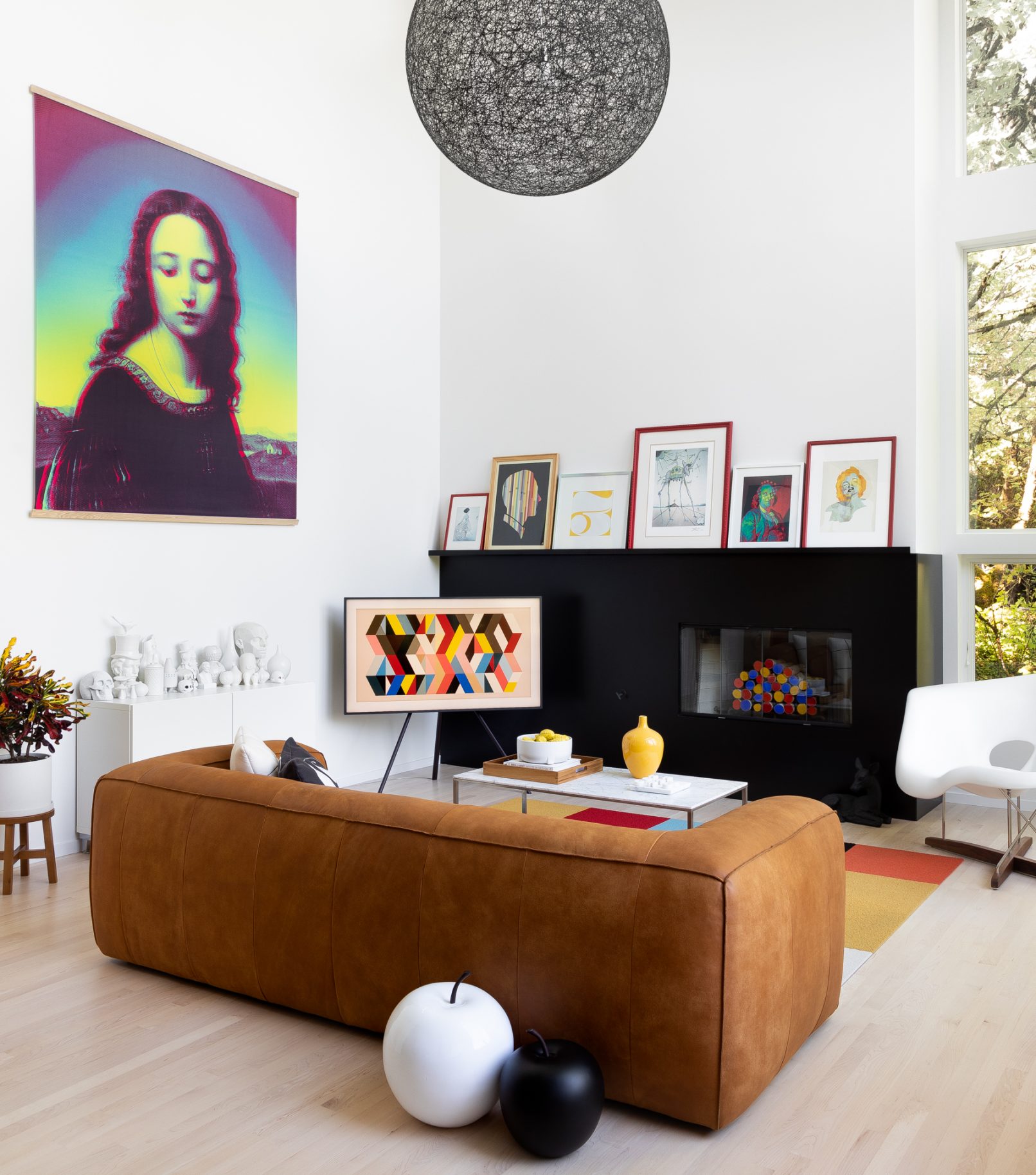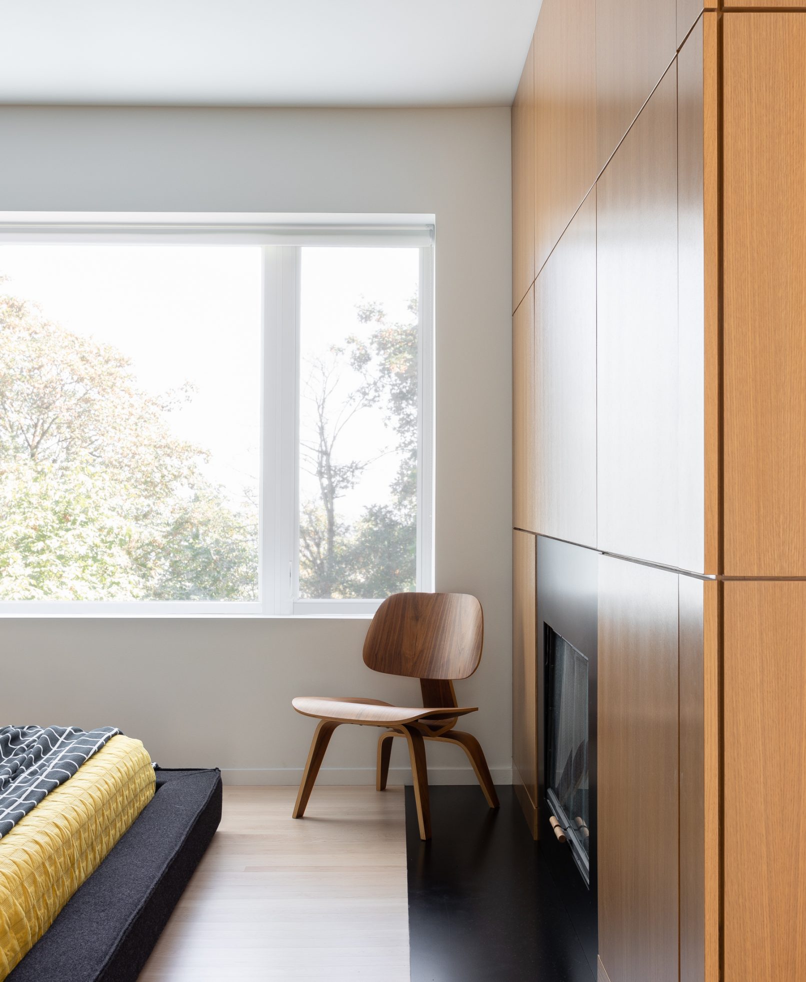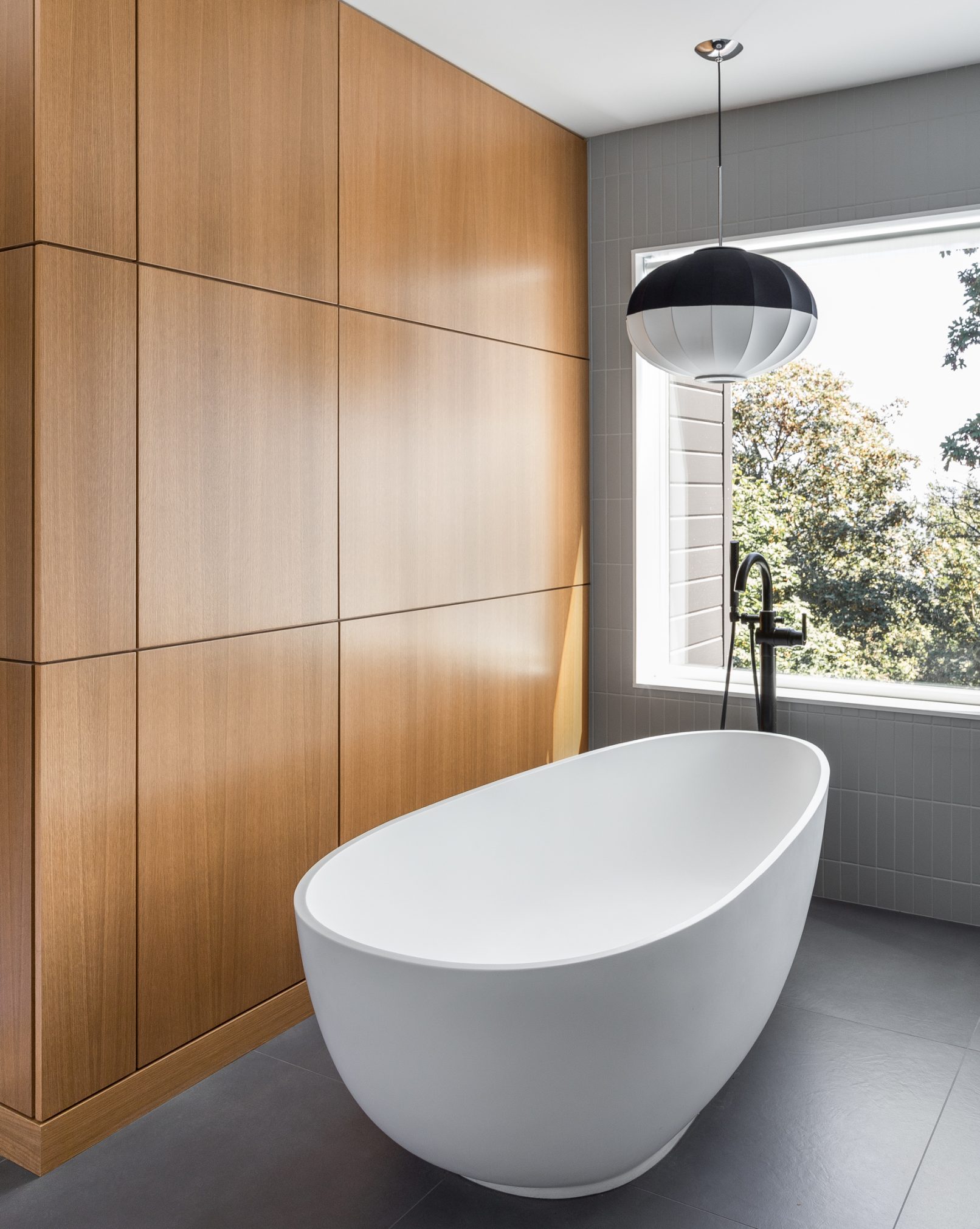 What began as a stereotypical early 90’s home, complete with angled soffits, pink sinks, glass block windows, and carpeted bathrooms, is now a unique modern abode sitting alongside a wooded hill in the SW Portland neighborhood of Healy Heights. The final design was a collaborative process between the THESIS design team, Hammer & Hand Construction, and the passionate and creative homeowners, both of whom are graphic artists. The owner’s design brief involved a restrained overall palette for the interior, creating a bright and airy “vessel” for their art, which is bold, punchy, and ever-changing. On the exterior, a moody black body color for the home is set off by powder-coated metalwork in primary colors – a striking visual surprise in the backdrop of the forest setting. A singular statement on the exterior comes in the form of a punched circular opening in a gabled parapet that highlights a roof deck inspired by the client’s favorite movie – Tim Burton’s Beetlejuice. The result is a home that is as much art as it is architecture, and is a deeply personal expression of the clients own unique aesthetic. Photos by Haris Kenjar Photography