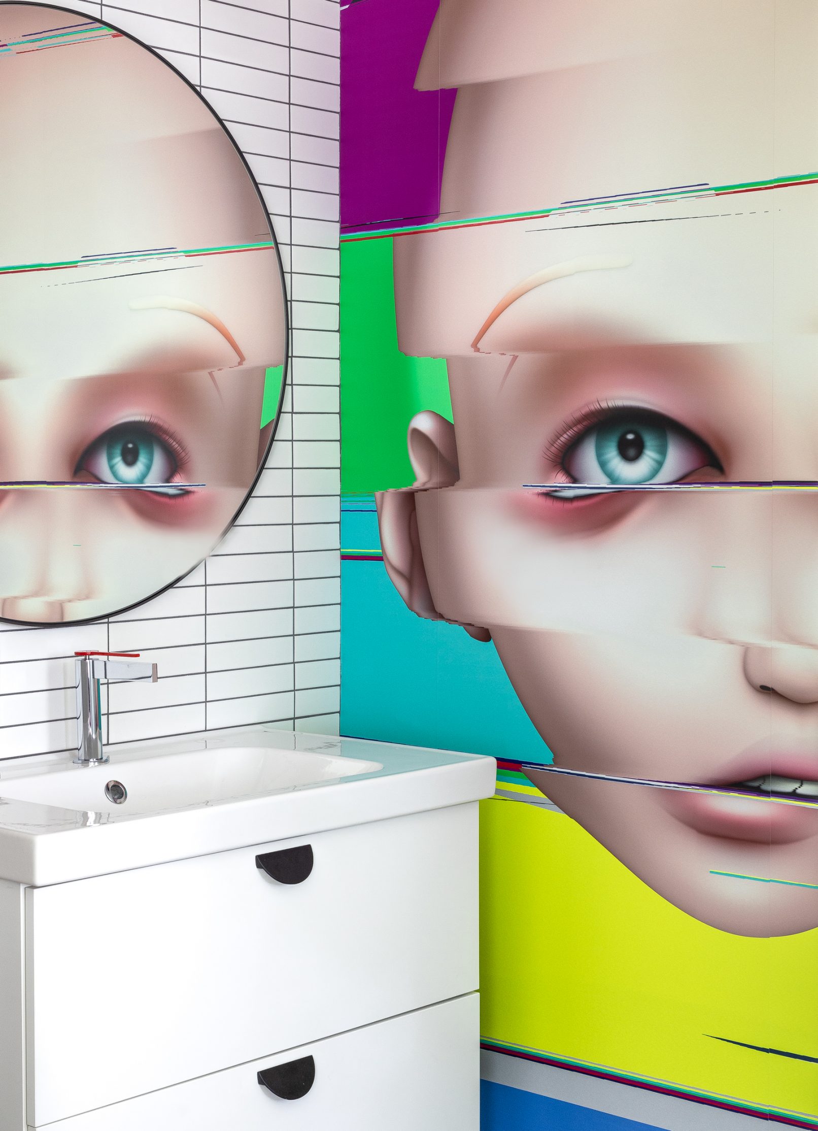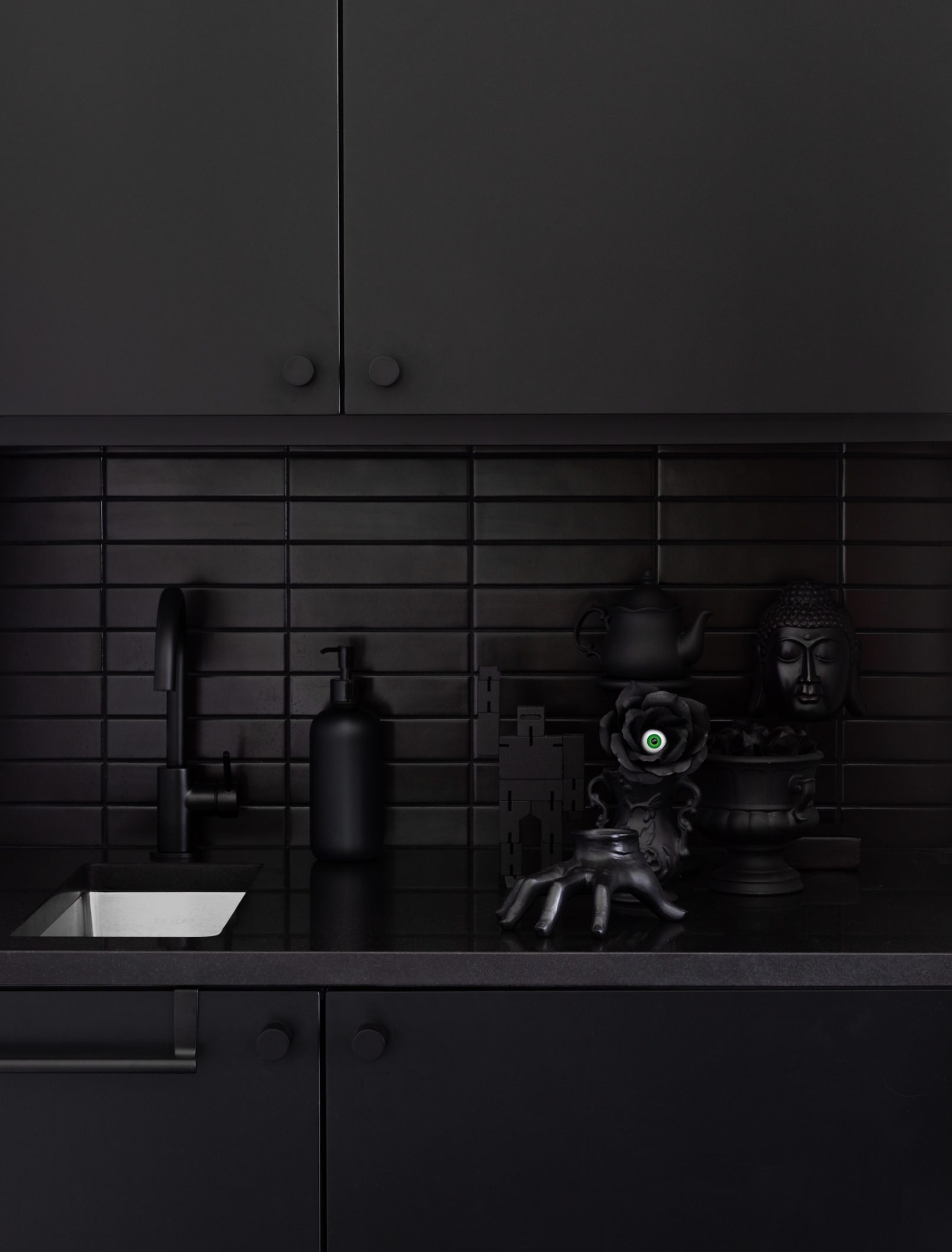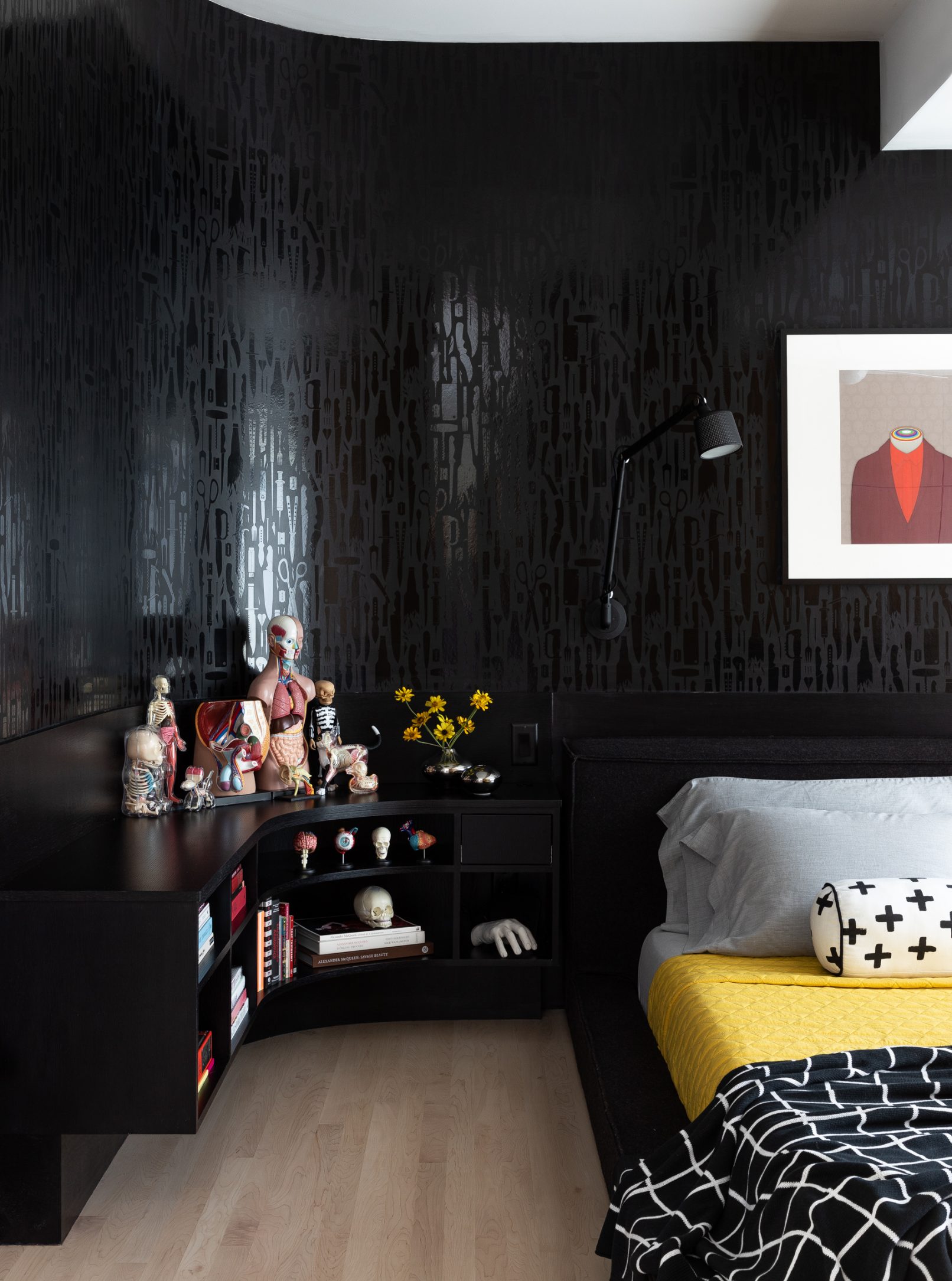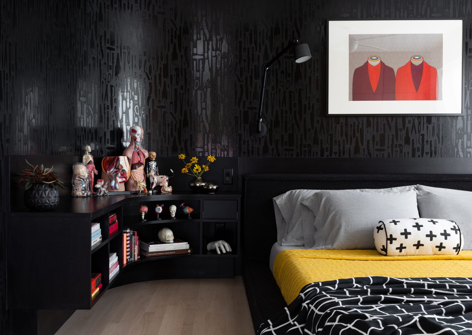 What began as a stereotypical early 90’s home, complete with angled soffits, pink sinks, glass block windows, and carpeted bathrooms, is now a unique modern abode sitting alongside a wooded hill in the SW Portland neighborhood of Healy Heights. The final design was a collaborative process between the THESIS design team, Hammer & Hand Construction, and the passionate and creative homeowners, both of whom are graphic artists. The owner’s design brief involved a restrained overall palette for the interior, creating a bright and airy “vessel” for their art, which is bold, punchy, and ever-changing. On the exterior, a moody black body color for the home is set off by powder-coated metalwork in primary colors – a striking visual surprise in the backdrop of the forest setting. A singular statement on the exterior comes in the form of a punched circular opening in a gabled parapet that highlights a roof deck inspired by the client’s favorite movie – Tim Burton’s Beetlejuice. The result is a home that is as much art as it is architecture, and is a deeply personal expression of the clients own unique aesthetic. Photos by Haris Kenjar Photography